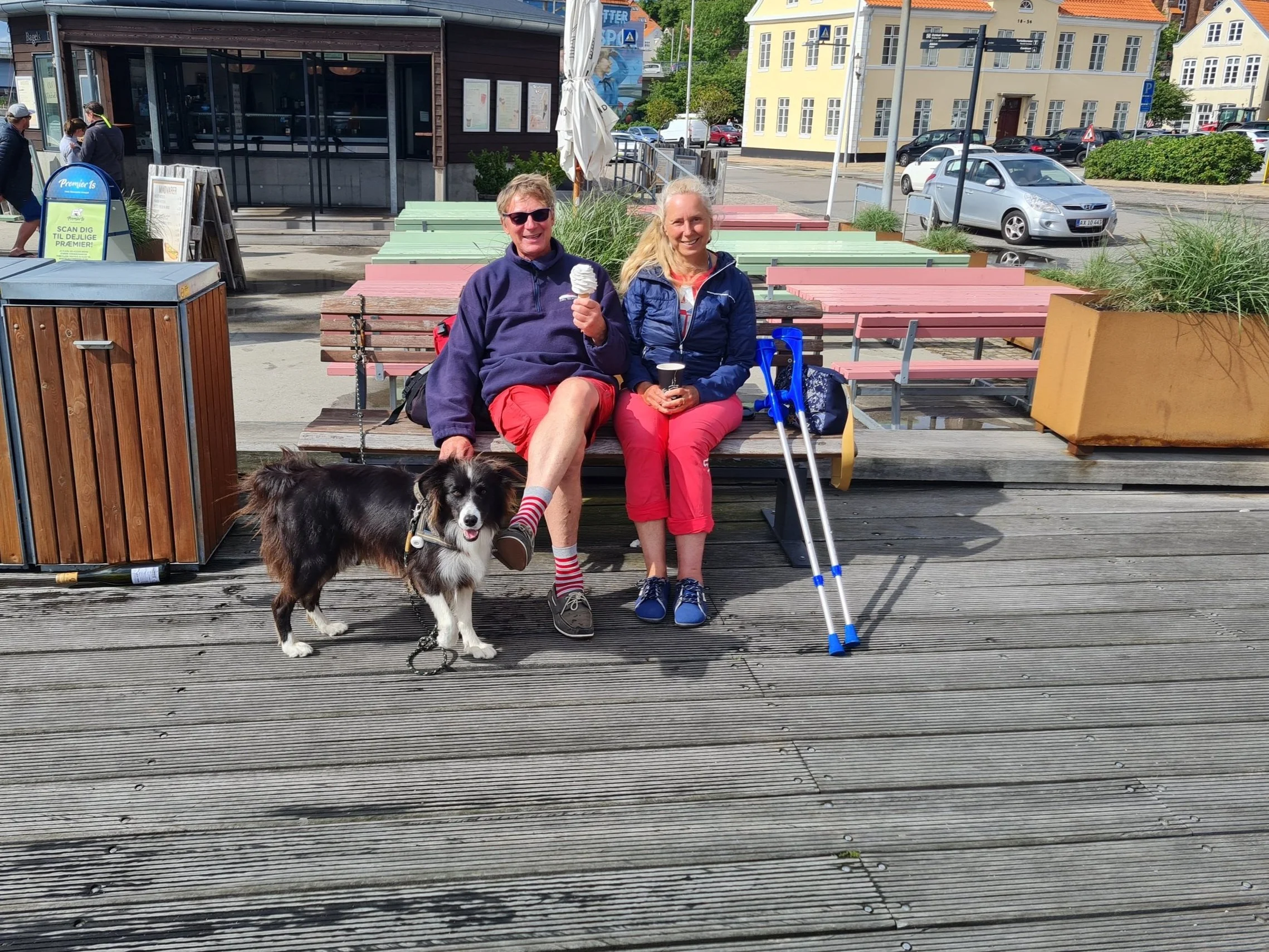 Elisabeth hat die erste Schraube entfernt bekommen und eine Woche später waren wir beim Segeln. die ersten Tagen waren Michael und Sani dabei. Ich denke wir haben alle Hürden mit an Bord und von Bord gehen gut gemeistert. Dank der Hilfe von Freunden Britta, Juliane, Matthias und Michi haben wir auch immer einen guten Liegeplatz längsseits bekommen. Bei diesem Bild in Sonderborg war dann der erste Spaziergang möglich. Ob es das Eis war?