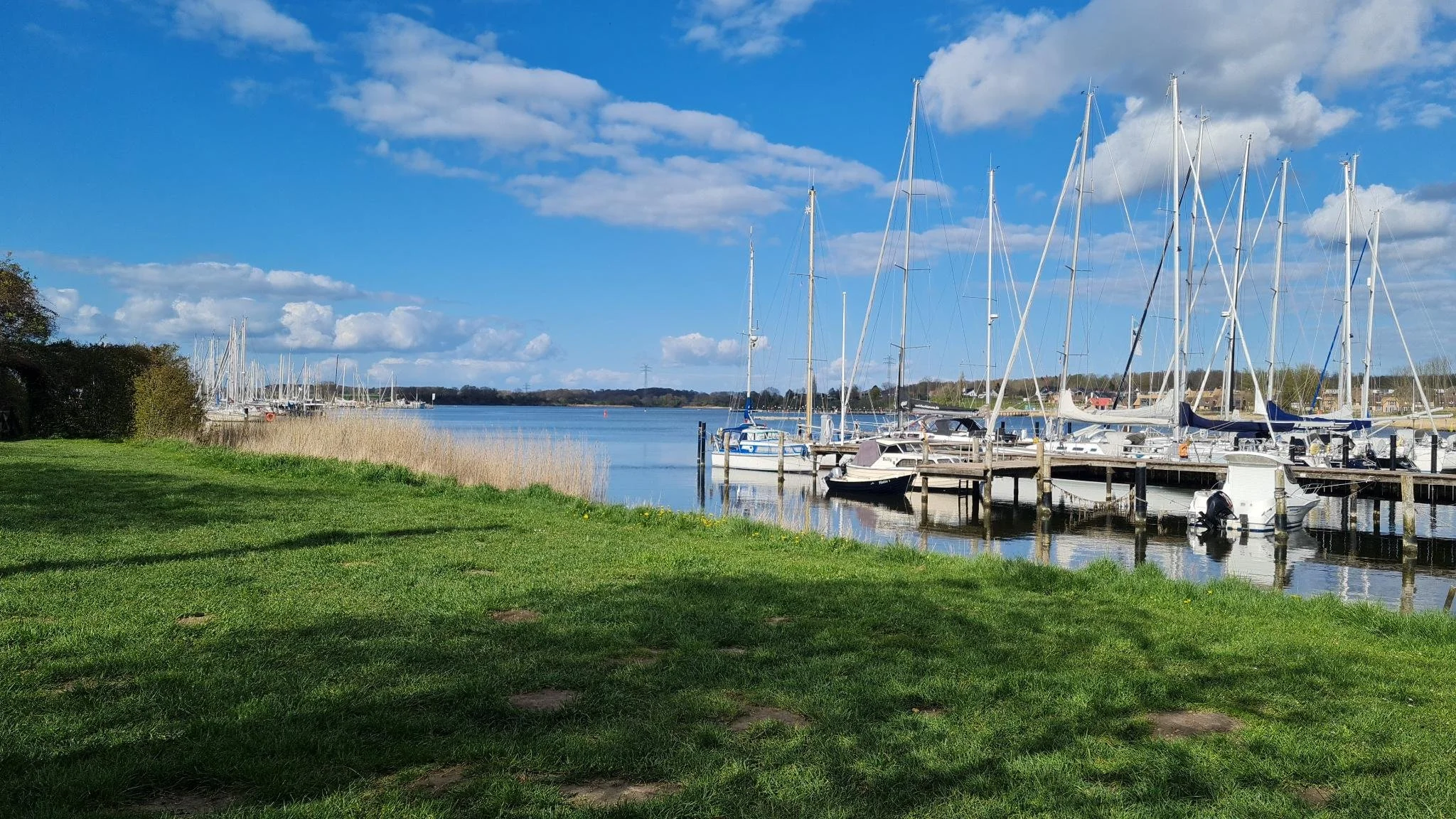 war es sehr versöhnlich. Die Sonne ist geblieben und es wurde sogar etwas wärmer - also fast 10° - in der Sonne. Ab morgen sollte es richtig schön werden. Stimmt auf der Rückreise habe ich es beobachten können. Hier mache ich gerade eine kleine Pause nach meinem Spaziergang zum Museumshafen und geniesse den Moment. Die Stapelfeld Werft ist ganz am Ende wo die weisse Fahne weht. Heute noch mal ein schöner Abend mit Freunden und viel Vorfreude auf den Juni.